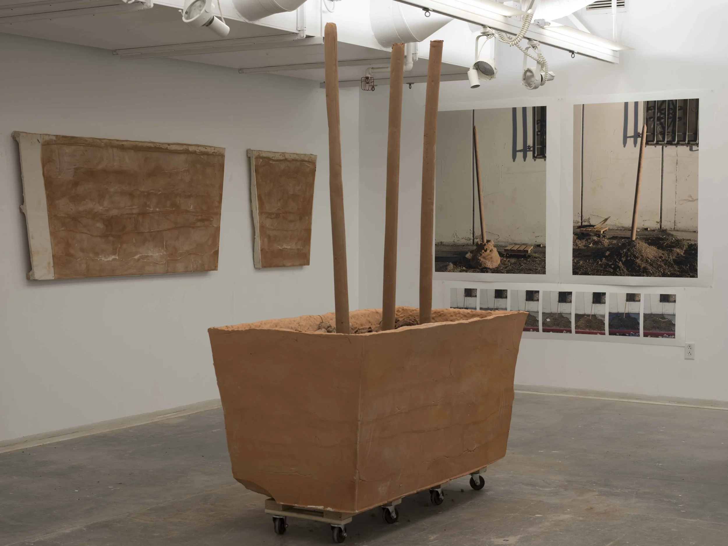 Fired and unfired earthenware, plywood, lumber, canvas, inkjet prints, two-channel video projection. 2018